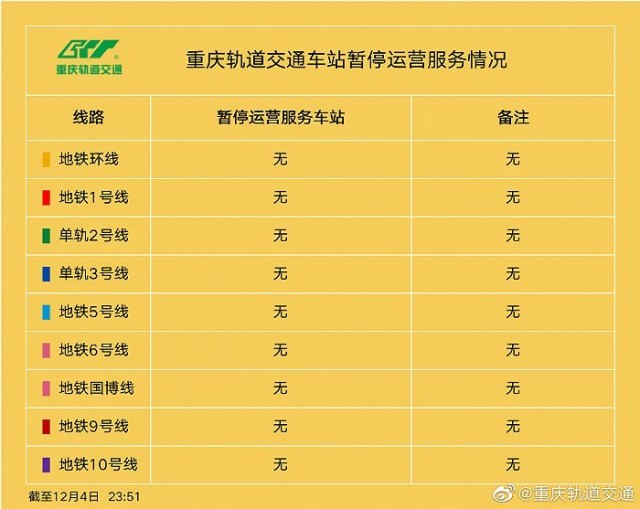 央視網(wǎng)消息:據(jù)@重慶軌道交通,12月5日06:30起,暫停運營服務的車站全部恢復運營服務。