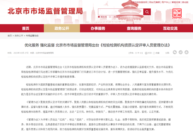 北京市市場監(jiān)督管理局出臺(tái)《檢驗(yàn)檢測機(jī)構(gòu)資質(zhì)認(rèn)定評審人員管理辦法》