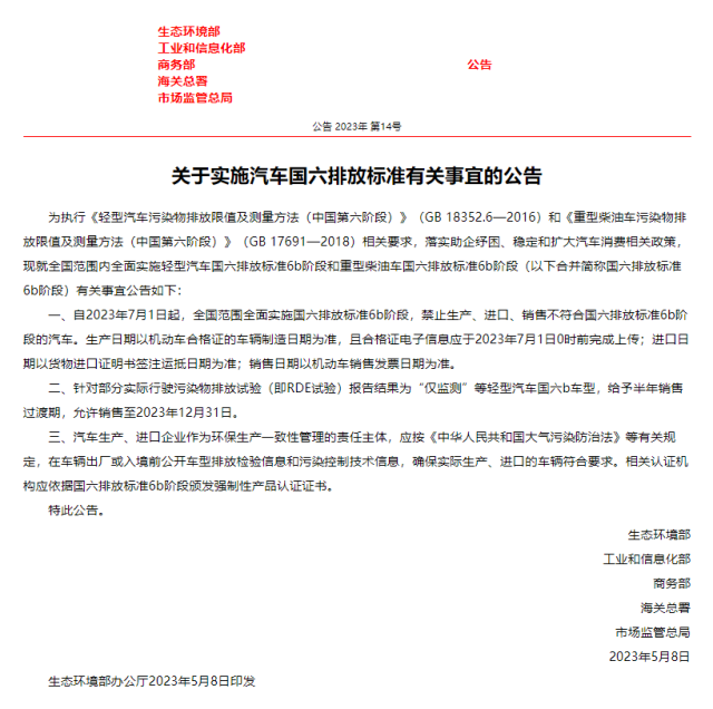 生態(tài)環(huán)境部辦公廳2023年5月8日印發(fā)關(guān)于實(shí)施汽車(chē)國(guó)六排放標(biāo)準(zhǔn)有關(guān)事宜的公告: