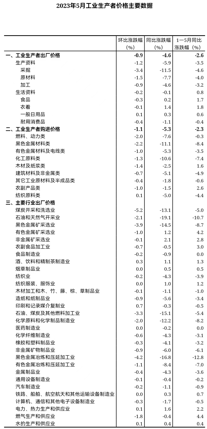 國家統(tǒng)計局:5月份工業(yè)生產(chǎn)者出廠價格同比下降4.6% 環(huán)比下降0.9%
