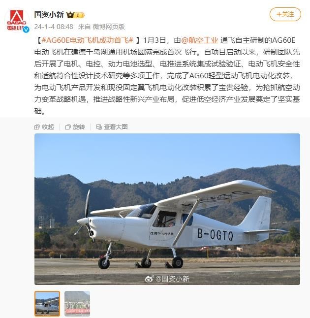 央視網消息:據@國資小新 消息,1月3日,由@航空工業(yè) 通飛自主研制的AG60E電動飛機在建德千島湖通用機場圓滿完成首次飛行。自項目啟動以來,研制團隊先后開展了電機、電控、動力電池選型、電推進系統(tǒng)集成試驗驗證、電動飛機安全性和適航符合性設計技術研究等多項工作,完成了AG60輕型運動飛機電動化改裝,為電動飛機產品開發(fā)和現(xiàn)役固定翼飛機電動化改裝積累了寶貴經驗,為搶抓航空動力變革戰(zhàn)略機遇,推進戰(zhàn)略性新興產業(yè)布局,促進低空經濟產業(yè)發(fā)展奠定了堅實基礎。
