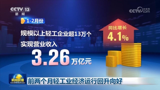 央視網(wǎng)消息(新聞聯(lián)播):中國輕工業(yè)聯(lián)合會(huì)發(fā)布數(shù)據(jù)顯示,今年前兩個(gè)月,消費(fèi)品制造業(yè)發(fā)展動(dòng)力增強(qiáng),帶動(dòng)輕工業(yè)經(jīng)濟(jì)運(yùn)行回升向好。1—2月,規(guī)模以上輕工企業(yè)超13萬個(gè),實(shí)現(xiàn)營(yíng)業(yè)收入3.26萬億元,同比增長(zhǎng)4.1%。