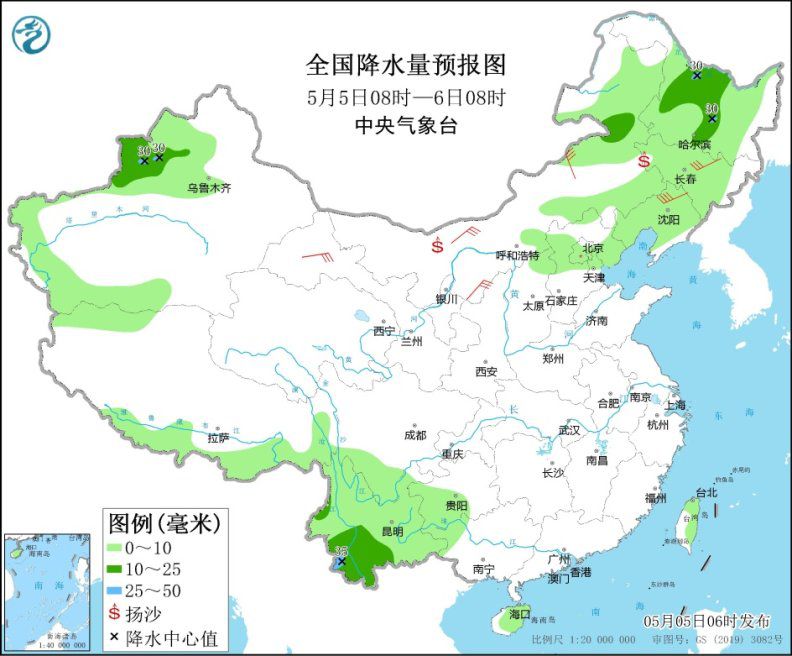5月5日8時至6日8時,新疆西北部、內(nèi)蒙古東部、華北中北部、東北地區(qū)大部、西南地區(qū)南部等地的部分地區(qū)有小到中雨,局地有大雨。甘肅河西、內(nèi)蒙古、東北地區(qū)等地有5~7級風(fēng),部分地區(qū)并伴有浮塵或揚沙天氣。渤海、渤海海峽、黃海北部和中西部海域?qū)⒂?~7級、陣風(fēng)8級的偏南風(fēng)轉(zhuǎn)東北風(fēng)。