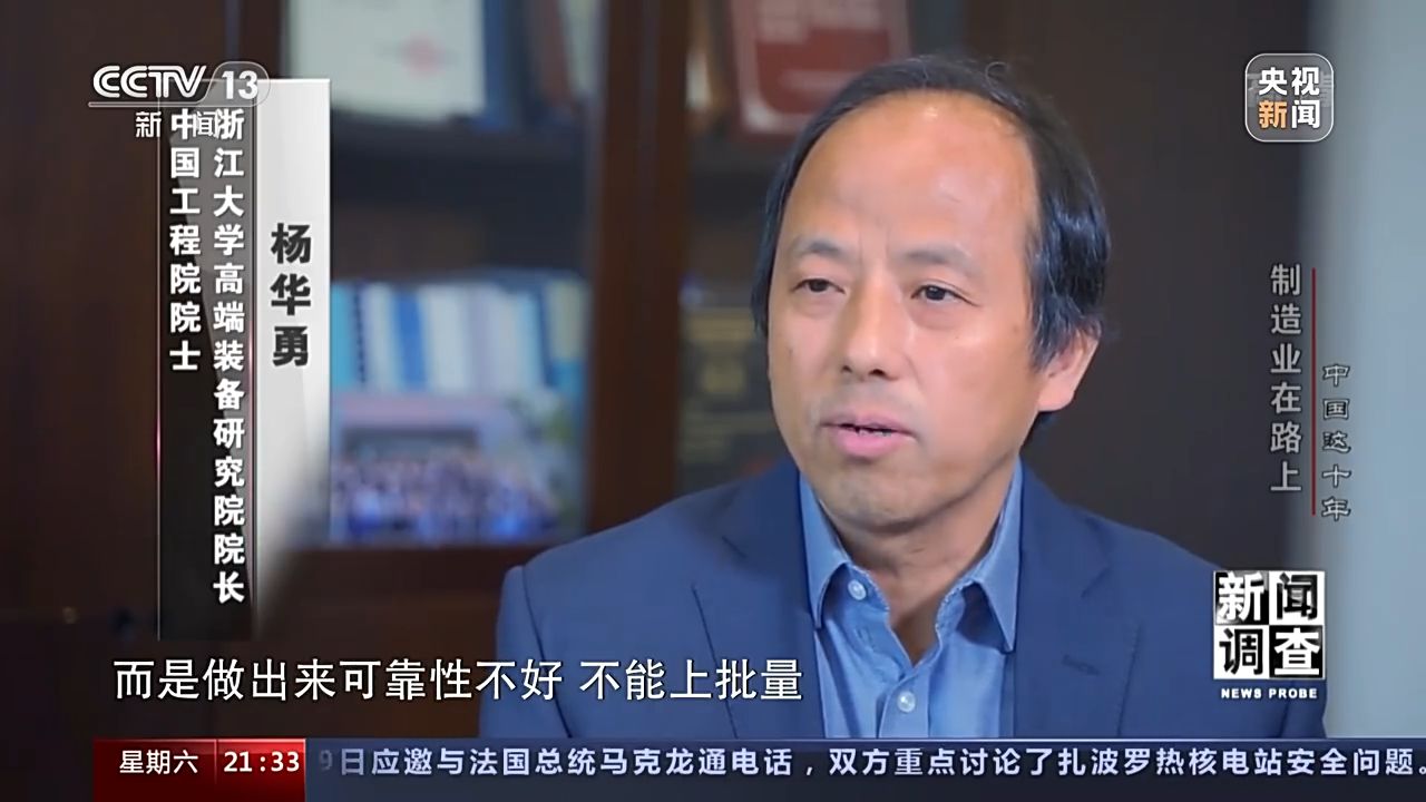 中國工程院院士 浙江大學高端裝備研究院院長 楊華勇:大噸位的起重機、挖掘機大量進口,咱們就沒有自己的,中國不是說做不出來,而是做出來可靠性不好,不能上批量。