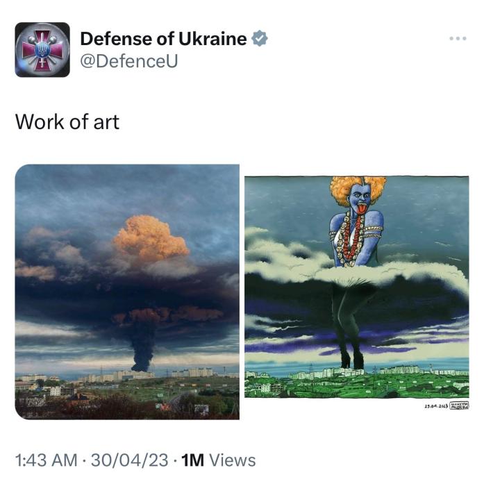據(jù)俄新社、《印度斯坦時(shí)報(bào)》等多家媒體描述,烏國防部4月30日發(fā)布的這條推文中包含兩張圖片,第一張描繪了塞瓦斯托波爾灣一油庫遭無人機(jī)襲擊后升起的煙柱;另一張則是以第一張為基礎(chǔ)創(chuàng)作的漫畫,爆炸的濃煙中多了一名女性形象,她擺出與瑪麗蓮·夢露掩住裙擺相似的姿勢,而這一女性形象本身又與印度教女神卡莉相似。烏克蘭國防部對圖片的描述是“藝術(shù)作品(work of art)”。