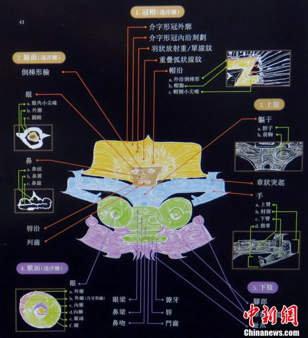 這個(gè)圖案的主體為“神人”,面部呈倒梯形,眼睛、鼻子、牙齒都非常寫(xiě)實(shí)。“神人”頭上還戴有高聳的羽冠,內(nèi)層刻有連續(xù)卷云紋的帽飾,外層為放射狀羽翎大冠?!吧袢恕钡乃闹家躁幖y細(xì)刻而成,上肢作抬臂、彎肘狀,五指平張?!吧袢恕钡纳硐率且恢环诘厣系纳瘾F(形似老虎),外框有橢圓形的眼瞼,之間以橋形凸面相連,有鼻梁和鼻翼,闊嘴內(nèi)有尖利的牙齒。