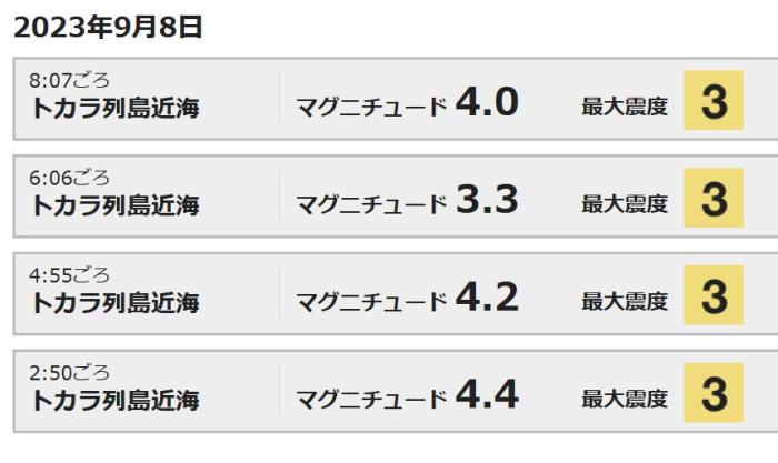 據(jù)報(bào)道,4次地震的震級(jí)分別為4.4級(jí)、4.2級(jí)、3.3級(jí)和4.0級(jí),震中都位于鹿兒島縣吐噶喇列島附近,附近的土島村有明顯震感。