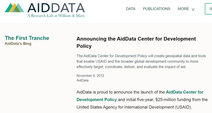 “援助數(shù)據(jù)”項(xiàng)目(AidData)官網(wǎng)上關(guān)于接受美國(guó)國(guó)際開發(fā)署最初5年2500萬美元資助的說明。