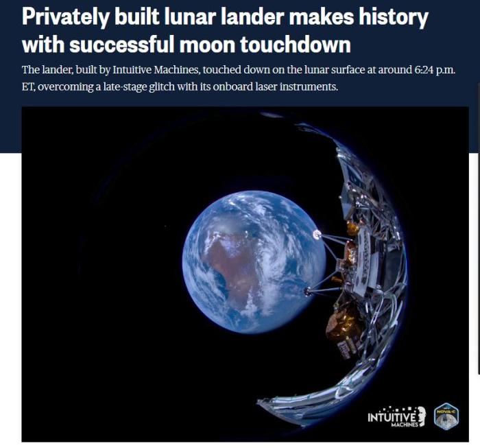 據(jù)報(bào)道,由“直覺機(jī)器” 研發(fā)的著陸器于美東時(shí)間下午6點(diǎn)23分左右降落在月球表面。該著陸器是自1972年“阿波羅17號”任務(wù)以來第一艘登上月球的美國航天器。