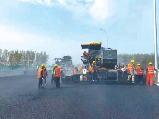 京雄高速六環(huán)至市界段路面鋪油施工現(xiàn)場(chǎng)。