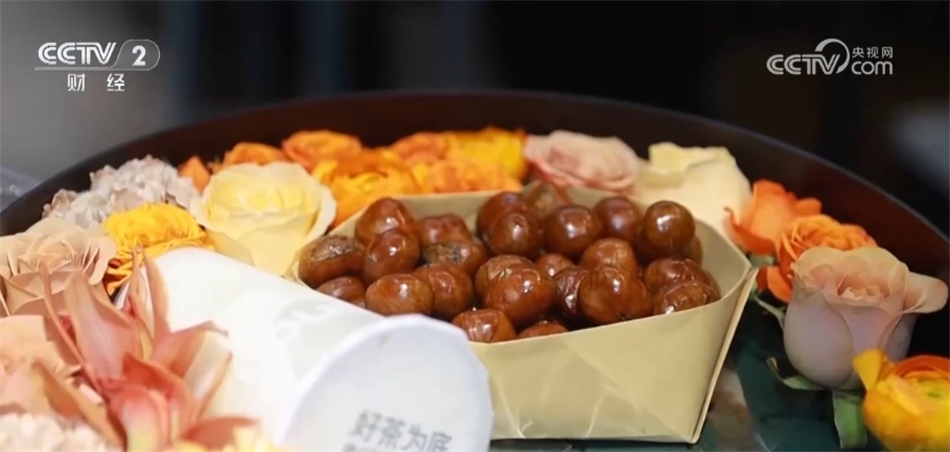 一些商家也是緊跟潮流,順勢(shì)推出“入冬四件套”禮盒。這家花店把鮮花、奶茶、糖葫蘆、糖炒栗子組合起來售賣,受到許多消費(fèi)者的歡迎。