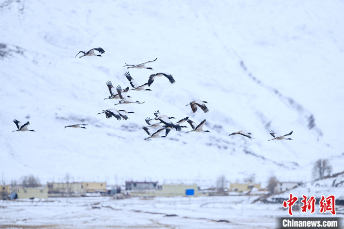 圖為2月23日,西藏林周縣虎頭山水庫(kù)附近村莊上空,一群黑頸鶴飛過(guò),遠(yuǎn)處白雪皚皚。 中新社記者 江飛波 攝