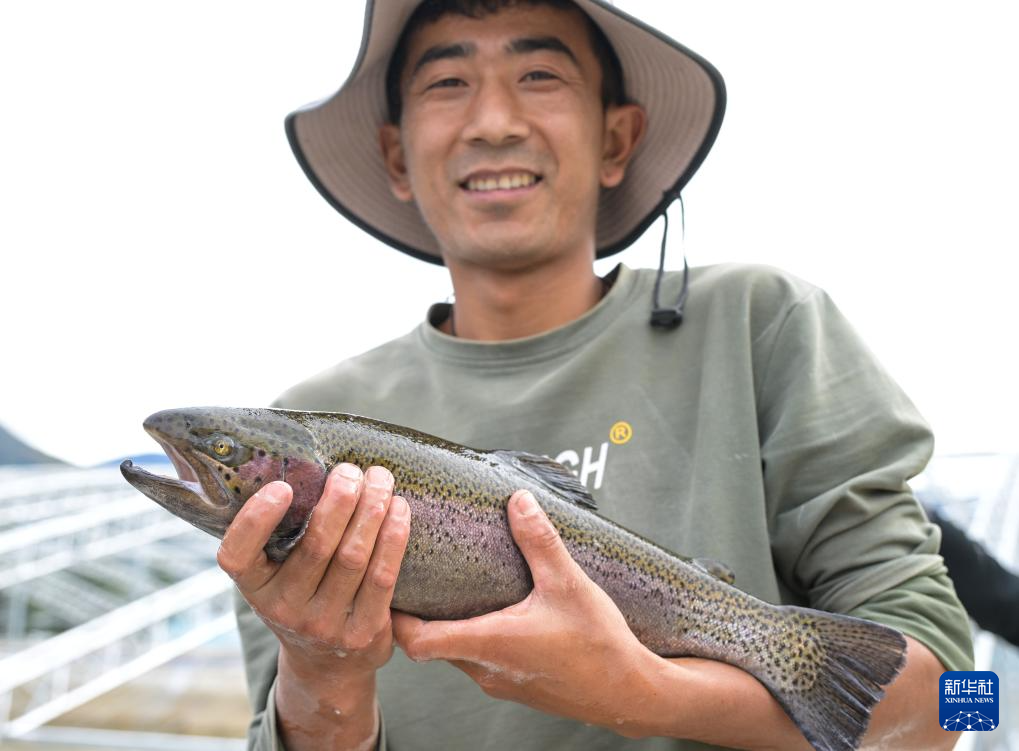 在西藏林芝市米林農(nóng)場的粵林高原漁業(yè)科技園工作的藏族小伙尼瑪旺堆在展示本地飼養(yǎng)的虹鱒魚(10月24日攝)。新華社記者 李賀 攝