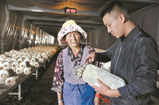 日前,記者來到林周縣大學(xué)生創(chuàng)業(yè)基地種菌大棚,看到兩名年輕小伙正在教授群眾菌菇種植知識。