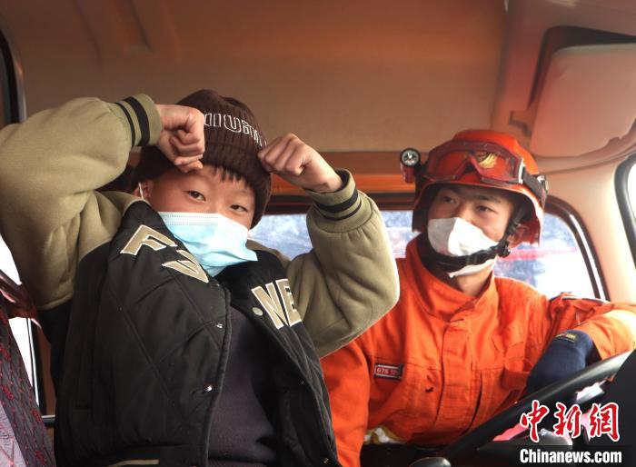 森林消防隊(duì)員組織小朋友體驗(yàn)消防車?!×种ナ猩窒拦﹫D