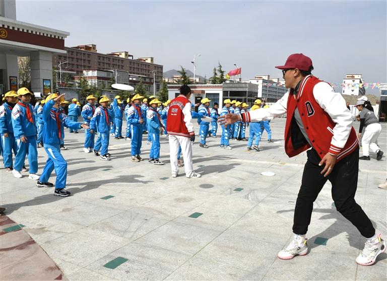 圖為學(xué)生們在教練的指導(dǎo)下進行飛盤傳接練習(xí)。記者 旦增蘭澤 攝