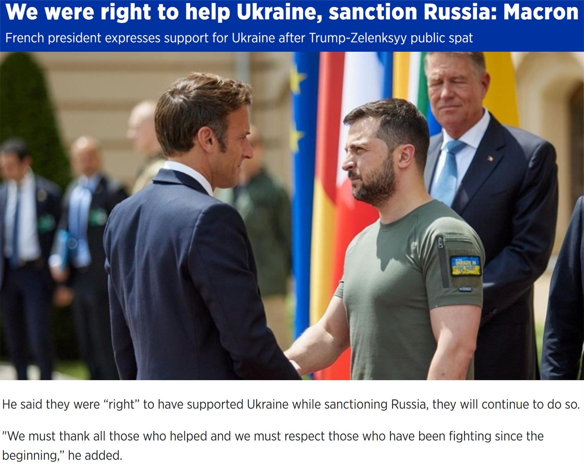 法國總統(tǒng)馬克龍在與澤連斯基通話后對媒體稱,西方支持烏克蘭是“正確”的,而且應(yīng)該繼續(xù)這樣做,因為“那些從一開始就在戰(zhàn)斗的人是在為歐洲的安全而戰(zhàn)”。
