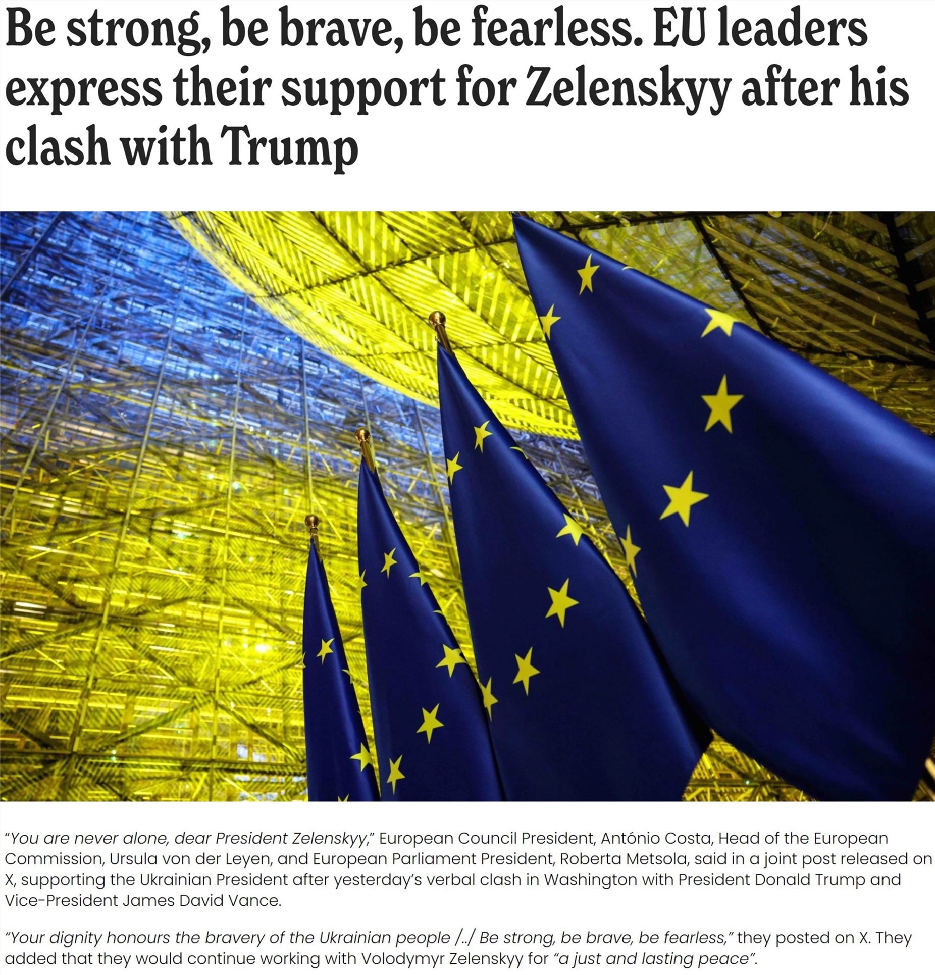 歐盟委員會主席馮德萊恩和歐洲理事會主席科斯塔在社交媒體上發(fā)表聯(lián)合聲明稱,歐盟將繼續(xù)與烏克蘭共同努力,力爭實現(xiàn)持久和平。