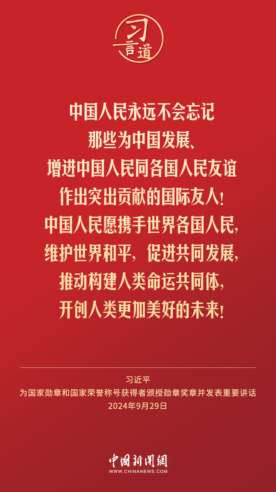 經(jīng)中共中央批準,中華人民共和國國家勛章和國家榮譽稱號頒授儀式于9月29日上午10時在人民大會堂隆重舉行。中共中央總書記、國家主席、中央軍委主席習近平向國家勛章和國家榮譽稱號獲得者分別授予“共和國勛章”“友誼勛章”和國家榮譽稱號獎?wù)虏l(fā)表重要講話。習近平指出——