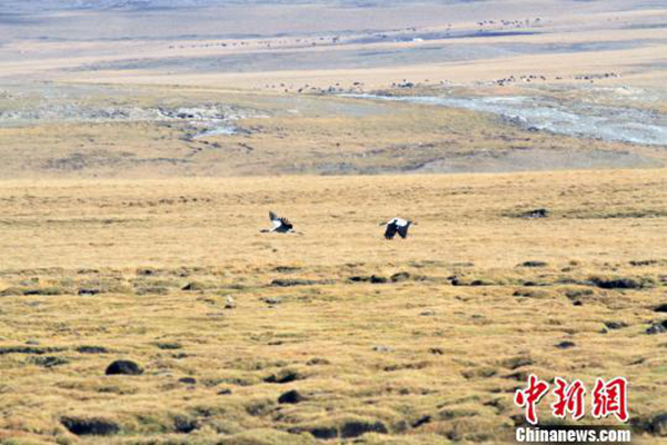 2017年9月,祁連山青海境內(nèi)共發(fā)現(xiàn)77只黑頸鶴,幼鶴占比19.5%。此次發(fā)現(xiàn)意味著“三江之源”“中華水塔”的青海省生態(tài)環(huán)境日趨向好。2017年青海省祁連山自然保護(hù)區(qū)管理局、北京林業(yè)大學(xué)自然保護(hù)區(qū)學(xué)院以及青海省雪聯(lián)青藏高原自然保護(hù)中心在祁連山南麓共同實(shí)施黑頸鶴調(diào)查,此前這一區(qū)域黑頸鶴分布及種群數(shù)量空白。圖為祁連山南麓青海側(cè)濕地拍攝到的黑頸鶴。