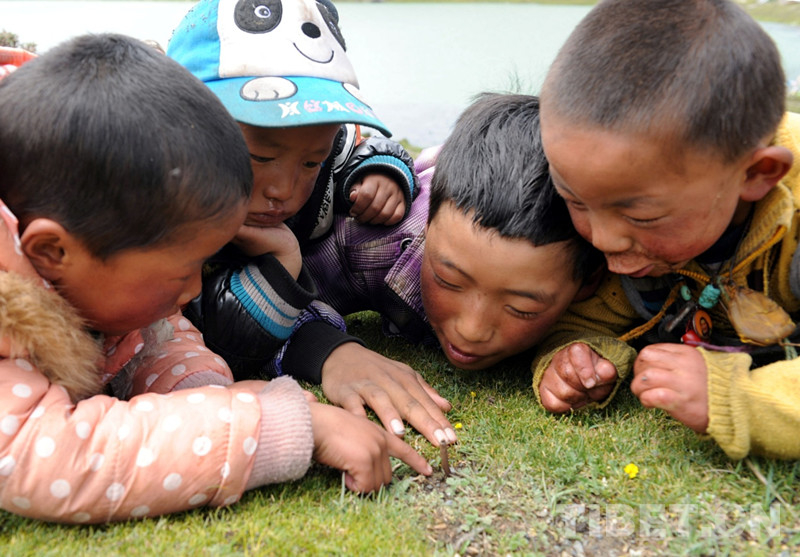 圖為藏族兒童在觀看所找到的蟲(chóng)草(唐召明2014年7月10日攝)