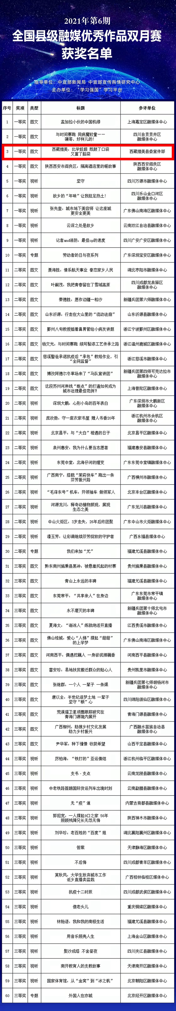 據(jù)了解,2021年第6期全國(guó)縣級(jí)融媒體中心優(yōu)秀作品雙月賽由中宣部新聞局、中宣部宣傳輿情研究中心指導(dǎo),“學(xué)習(xí)強(qiáng)國(guó)”學(xué)習(xí)平臺(tái)主辦,各?。▍^(qū)、市)和新疆生產(chǎn)建設(shè)兵團(tuán)學(xué)習(xí)平臺(tái)協(xié)助組織、共同實(shí)施,各省級(jí)學(xué)習(xí)平臺(tái)對(duì)投稿作品進(jìn)行初評(píng),評(píng)選出299件優(yōu)秀作品,“學(xué)習(xí)強(qiáng)國(guó)”學(xué)習(xí)平臺(tái)組織專家評(píng)審團(tuán)隊(duì)對(duì)優(yōu)秀作品進(jìn)行復(fù)評(píng)、終評(píng),最終評(píng)選出60件獲獎(jiǎng)作品。