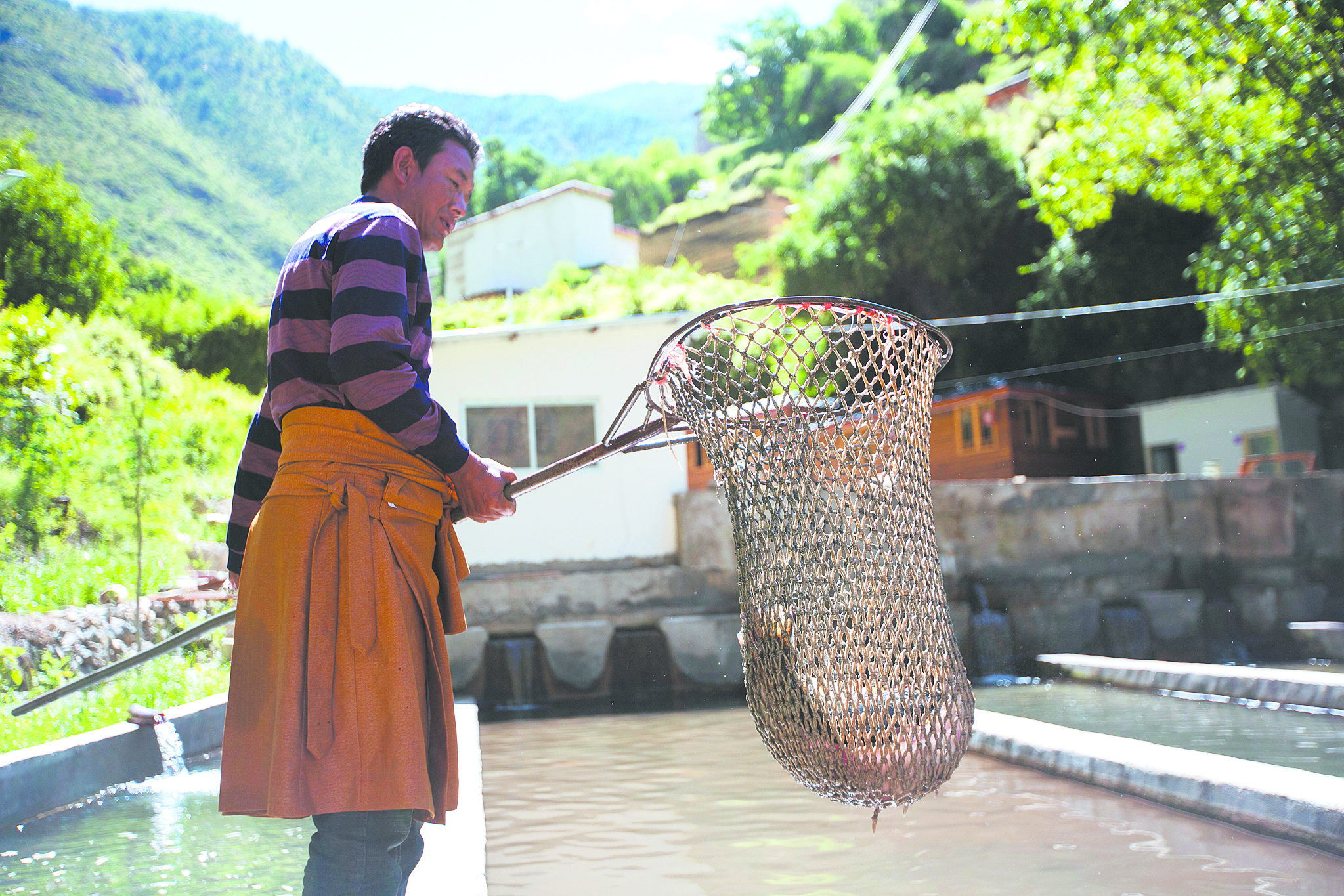在成品魚池前,38歲的藏族老鄉(xiāng)彭錯(cuò)正拿著網(wǎng)兜撈魚。今天有買家來看魚,他負(fù)責(zé)撈幾條樣品給人看。用攔截網(wǎng)片把魚群逼到狹窄的水道內(nèi),彭錯(cuò)熟練地拿起網(wǎng)兜在水中一攪,兩條肥碩的裂腹魚從水塘中一躍而起,褐色的鱗片在陽光下閃閃發(fā)光。彭錯(cuò)不慌不忙,牢牢把住網(wǎng)兜左右一揮,兩條大魚便被捕入網(wǎng)中?!爸辽儆腥慕镏?,肉質(zhì)緊實(shí),品質(zhì)很不錯(cuò)!”趕來查看的買家一邊抓魚一邊夸贊。