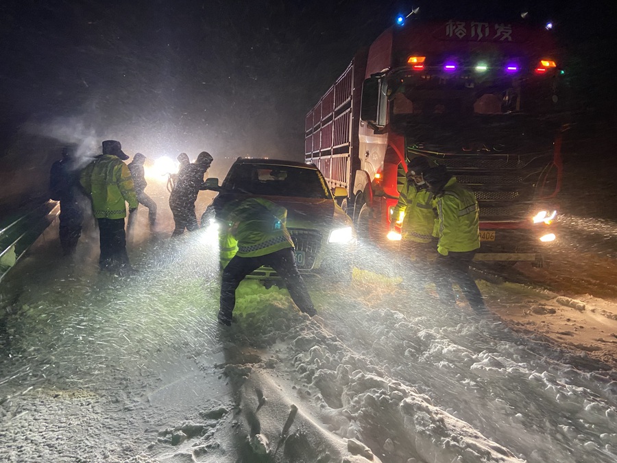 近日,青海省果洛藏族自治州瑪多縣境內(nèi)迎來降雪天氣,瑪多縣公安局交警大隊全體民警、輔警,路政及公路養(yǎng)護部門的工作人員不畏嚴寒,堅守一線,全力以赴保障道路暢通和群眾平安。