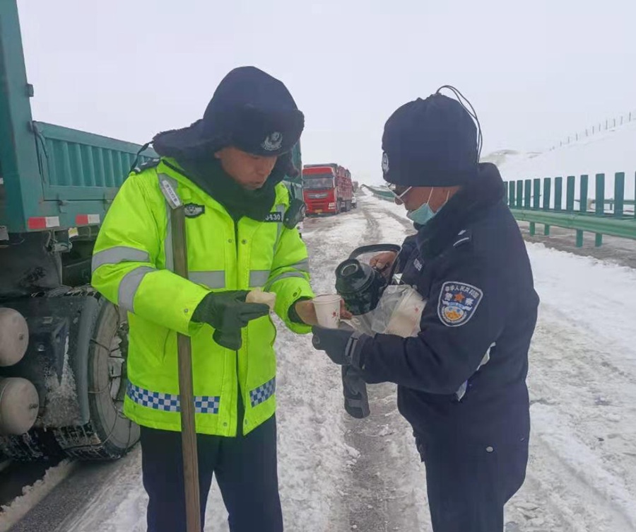 李西和同事們紛紛拿起鐵鍬將積雪鏟至道路兩邊,迅速開辟出一條臨時車道,讓車輛緩慢通行,這時他們已經(jīng)連續(xù)奮戰(zhàn)7個多小時。民警吃的是溫水泡的方便面,渴了就喝冰涼的礦泉水,或者直接抓一把雪塞到嘴里。累的實在不行就隨便找個能擋風的地方睡一會。有時候遇到堵車,有些司乘人員沒有帶食物,大家還把自己的口糧分給他們,他們只能挨著餓。