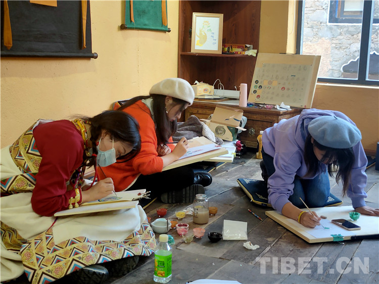 圖為游客體驗藏族傳統(tǒng)美術(shù)工藝