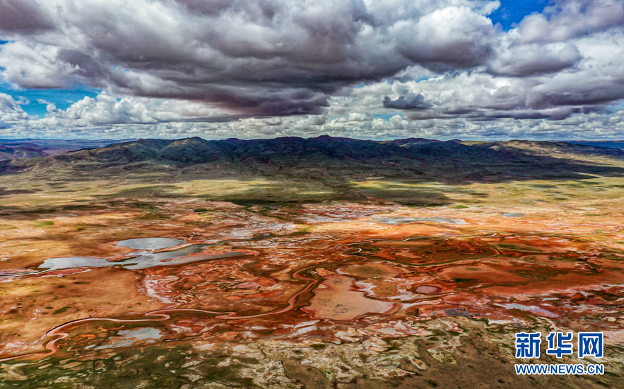 高空俯瞰阿拉克湖國(guó)家濕地公園,大地紋理清晰、赤紅嫩綠分明。