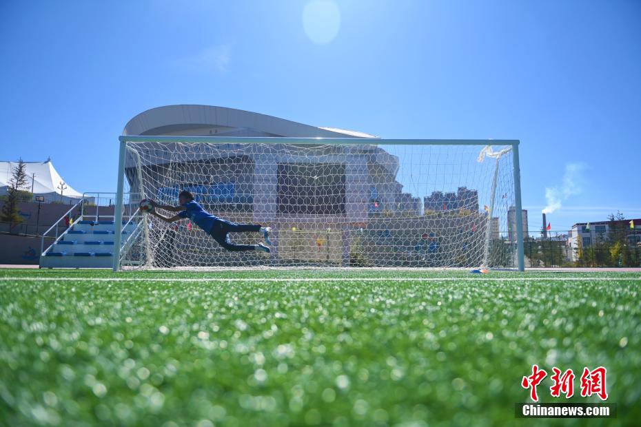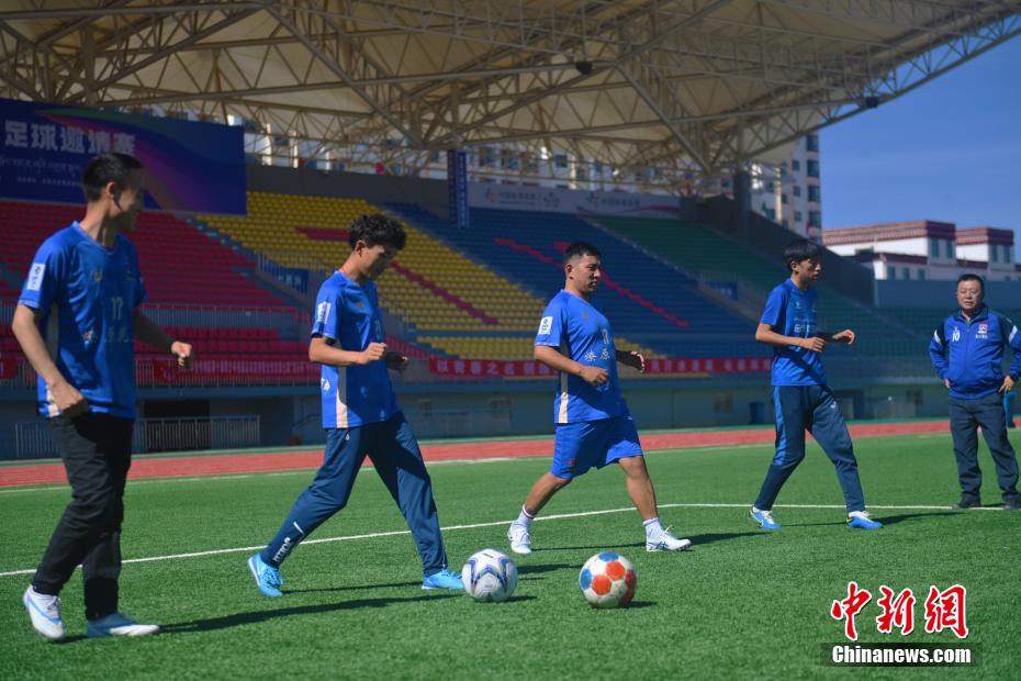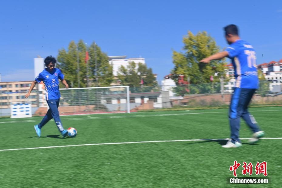 10月15日,在甘肅省甘南藏族自治州合作市一足球場內(nèi),甘南九二聯(lián)隊足球隊員進(jìn)行訓(xùn)練。