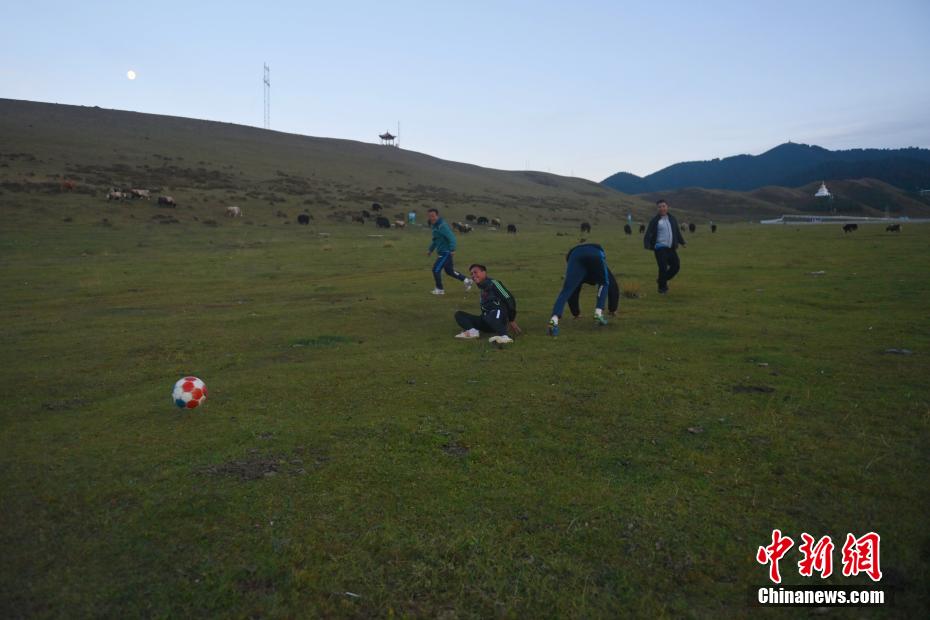 10月15日,在甘肅省甘南藏族自治州合作市一牧場內(nèi),甘南九二聯(lián)隊足球隊員進(jìn)行訓(xùn)練。該足球隊已成立32年,由牧民、務(wù)工者、歌舞演員、個體戶、老師、學(xué)生等組成,如今已歷經(jīng)三代球員的成長。