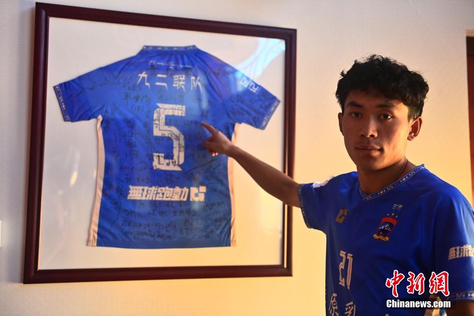 10月14日,在甘肅省甘南藏族自治州合作市甘南九二聯(lián)隊俱樂部榮譽(yù)展廳內(nèi),隊員更高才讓介紹該隊5號是中國足球協(xié)會杯第一個進(jìn)球的藏族球員。