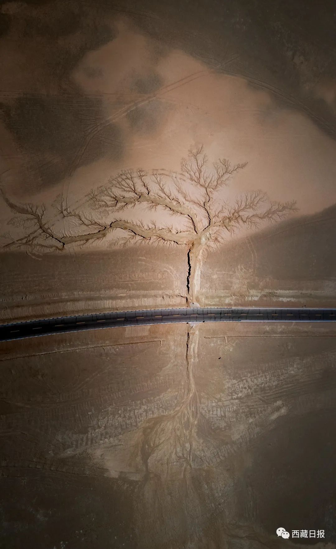 位置:“大地之樹”位于達(dá)則措南,距離尼瑪縣城30公里處,國(guó)道317 (2442)里程石墩旁邊。這棵大地之樹的樹干在國(guó)道南側(cè),樹根在國(guó)道北側(cè)。