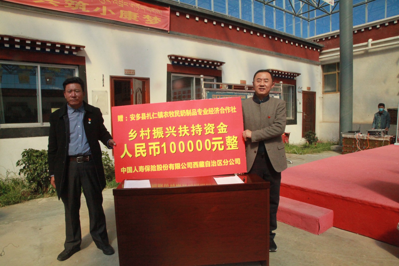 圖為中國(guó)人壽西藏分公司向那曲市安多縣扎仁鎮(zhèn)納色社區(qū)捐贈(zèng)產(chǎn)業(yè)扶持資金10萬(wàn)元。