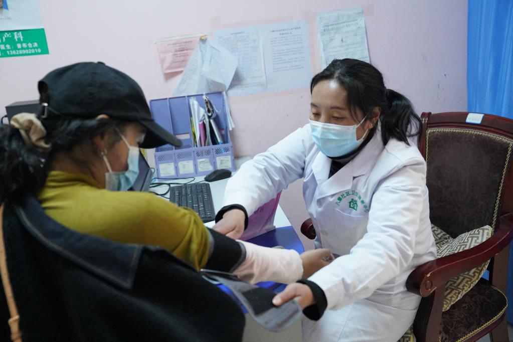 拉薩市八廓街道社區(qū)衛(wèi)生服務中心的醫(yī)生(右)在為群眾做檢查。新華社記者黃耀漫 攝