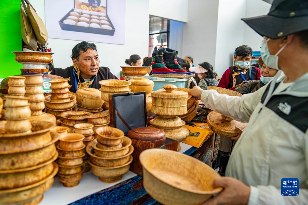 6月17日,工作人員在第五屆藏博會現(xiàn)場為顧客介紹木碗產(chǎn)品。新華社記者 孫非 攝