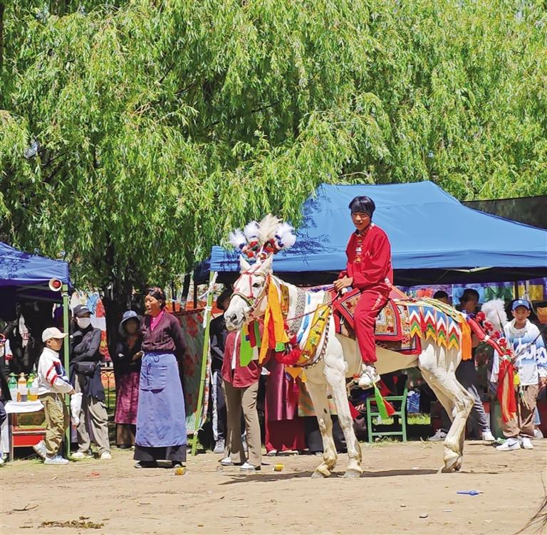 賽場上,幾個稚嫩的小伙子引起了大家的注意。他們熟練地跳上馬背、抓緊韁繩、目光堅定?!巴?!太棒了!”“媽媽,那個哥哥拿到了哈達!”……只見16歲的單增阿旺策馬奔騰,俯身拾起地上的綠色哈達,獲得大家的陣陣掌聲?!拔覐男【秃芟矚g騎馬,除了去年因為學(xué)業(yè)緊張,沒能參加賽馬表演,往常每年都會參加?!眴卧霭⑼f。