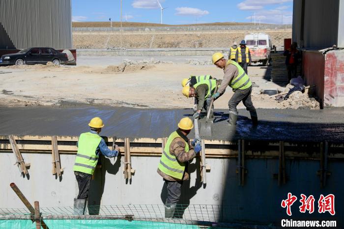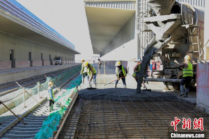圖為西藏那曲物流園區(qū)綜合5站臺(tái)大修施工現(xiàn)場進(jìn)行混凝土澆筑作業(yè)。馬生明 攝