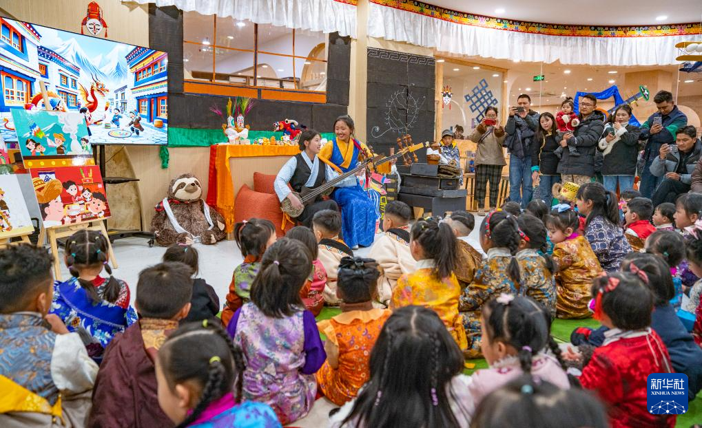 2月3日,手偶表演演員在拉薩的兒童藏裝派對上和孩子們互動。新華社記者 丁增尼達 攝