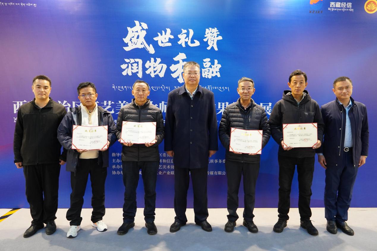 “西藏自治區(qū)工藝美術(shù)大師評(píng)選成果作品展”由西藏自治區(qū)經(jīng)濟(jì)和信息化廳、西藏自治區(qū)民族事務(wù)委員會(huì)聯(lián)合主辦,于2024年11月7日在民族文化宮展出。本次捐贈(zèng)作品為“西藏自治區(qū)工藝美術(shù)大師評(píng)選成果作品展”中的5件代表性精品力作,包括唐卡作品《格薩爾王》(復(fù)制件)(作者:貢覺(jué)杰)、《文成公主建小昭寺》(復(fù)制件)(作者:羅布斯達(dá))、《一枝一葉總關(guān)情》(復(fù)制件)(作者:珠木巧),堆繡作品《金絲野牦?!罚ㄗ髡?晉美洛追)、《石榴籽》(作者:晉美洛追)。任毅同志向作者頒發(fā)了收藏證書(shū),并表示誠(chéng)摯感謝。