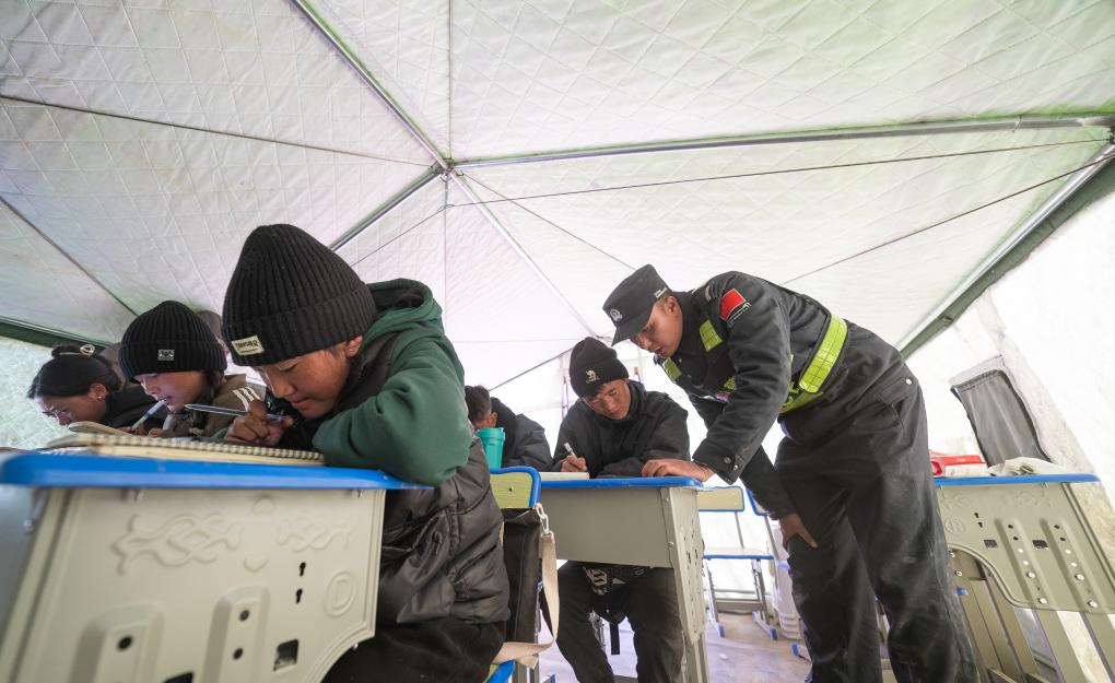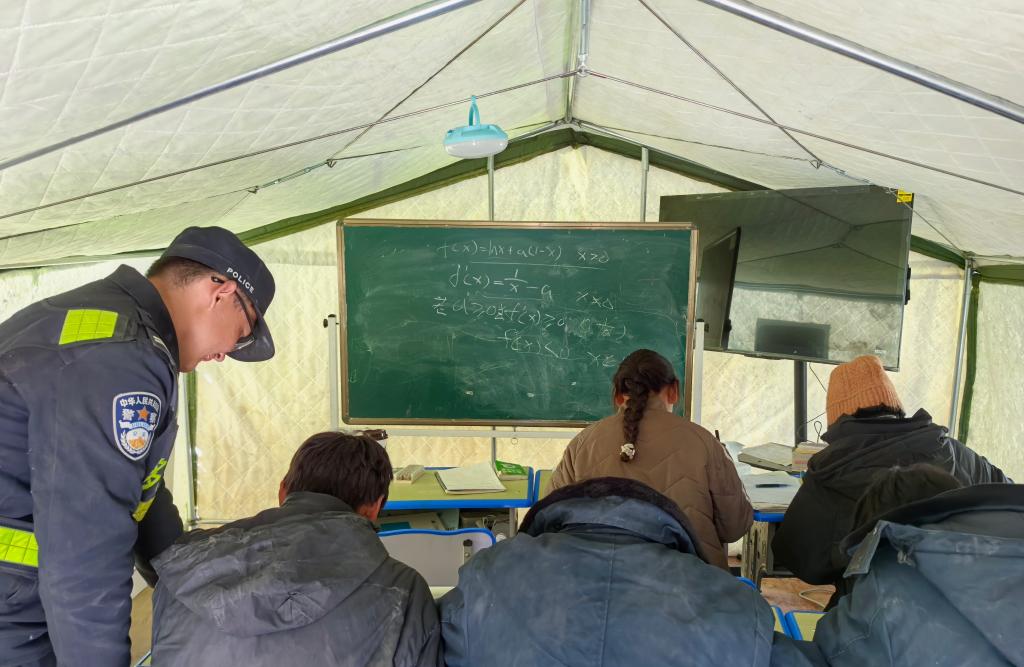 在西藏日喀則市定日縣長(zhǎng)所鄉(xiāng)嘎布村安置點(diǎn)的帳篷內(nèi),民警劉鑫磊一手指了指黑板上的題目,一手拿著資料,耐心地給高三學(xué)生講解。5名學(xué)生坐在課桌前,低著頭,快速地在草稿紙上演算著。