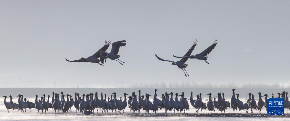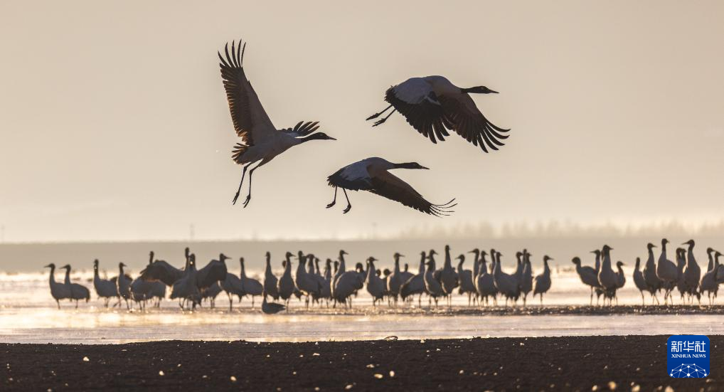 拉薩北部的林周縣平均海拔約4200米,是黑頸鶴的主要越冬地之一。清晨的陽光灑在林周縣虎頭山水庫,水面波光粼粼,鶴影婀娜多姿。